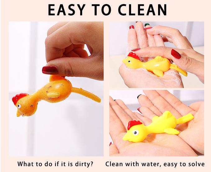 Quantity: 10 pack lovely sculpt flick chicken flying chicken flingers stretchy funny rubber chickens, a sufficient quantity for your daily use; Easy to play: Pull, stretch, and fling these flick chickens; Eject it to the wall, let it roll down, the process is very funny; Or play it with your friends and see who shot further; Suitable for children over 10 years old; Material: TPR material allows availability for both children and adults, the rubber chickens toy is non-toxic and flexible (TPR is a non-toxic and environment-friendly material with hardness and dynamic viscosity allocated.The Turkey is soft and sticky, stretchable by hand and can be catapulted onto walls and glass.); Easy to wash: wash the stretchy chicken toy with soap and water when dirty; You can play it in any environment, easy to clean; Material: TPR; Size: 11.5 X 4.5cm/4.53 X 1.77; Age Appropriate: 10Y+.